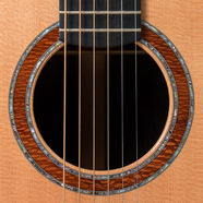 This guitar is the second of a series of two OM guitars constructed with traditional Martin style bracing. The soundboard is Sitka spruce, back and sides are EI Rosewood, curly koa binding and back strip, abalone purfling, and a lacewood rosette with double abalone rings. It has a five piece neck with the center strip of mahogany. The fretboard and headplate are ebony, with abalone dots and diamond inlays in the fretboard. Dark Brazilian rosewood bridge with ebony bridge pins. The finish is my first effort with Royal-Lac shellac based finish.